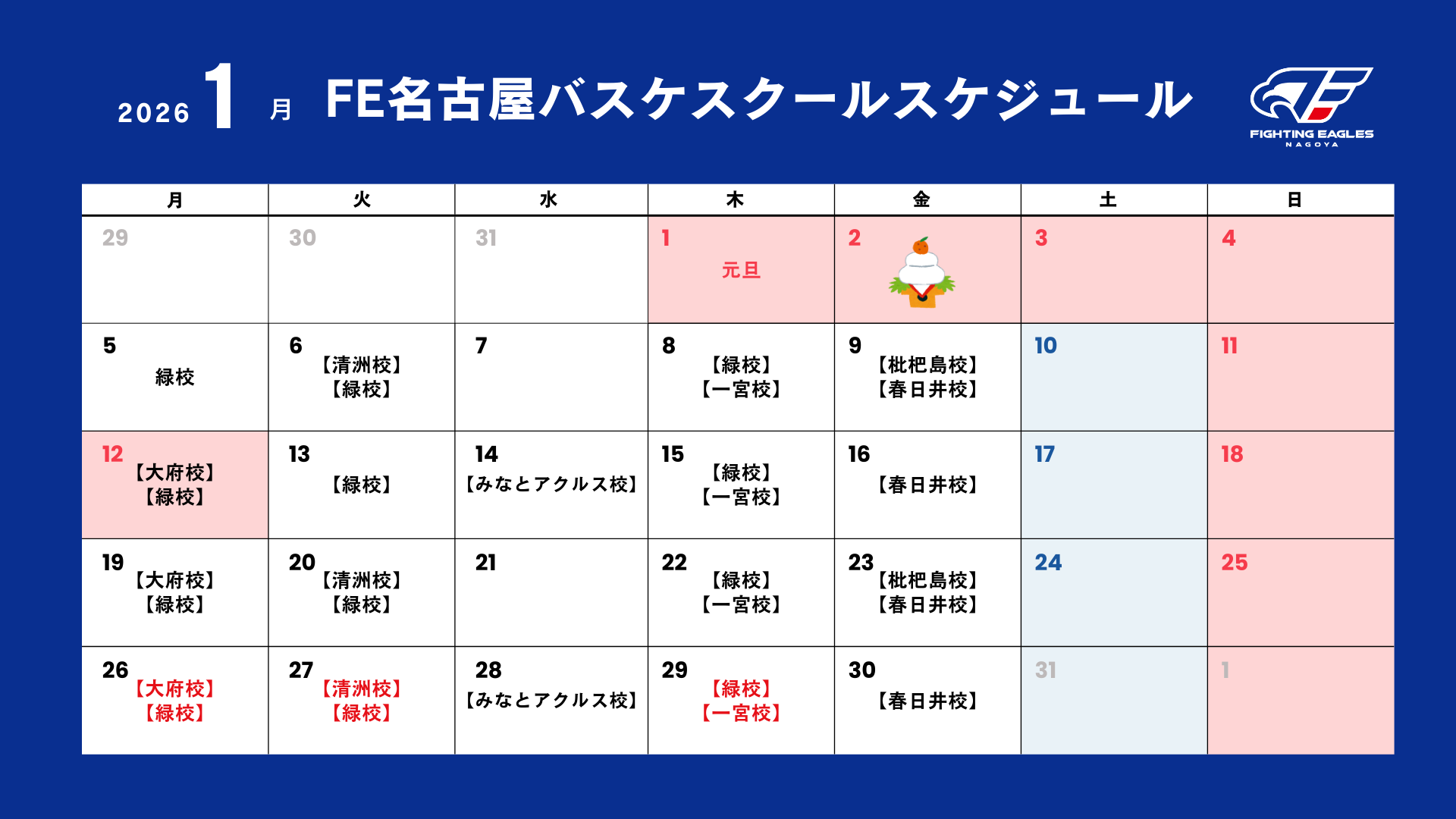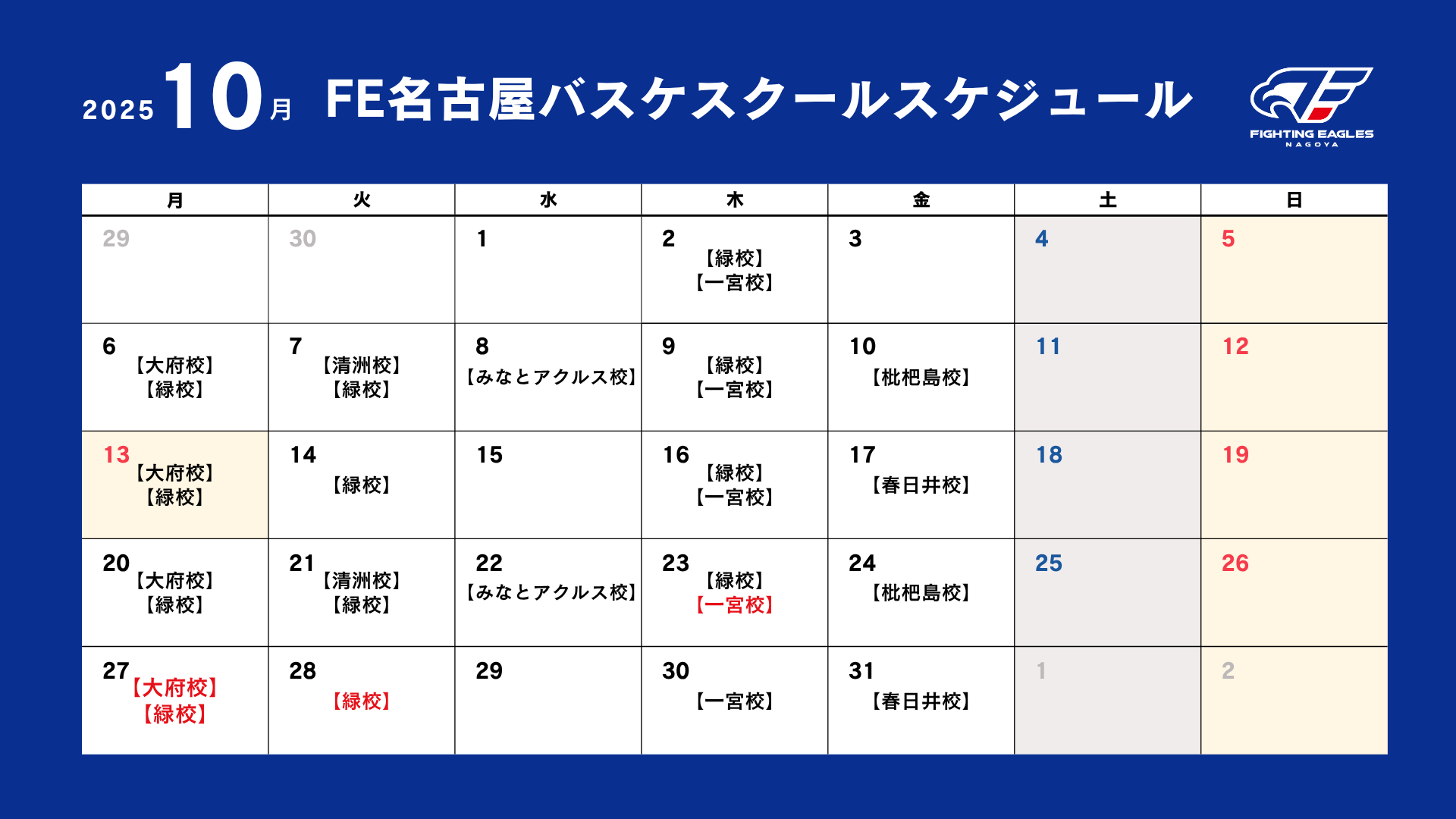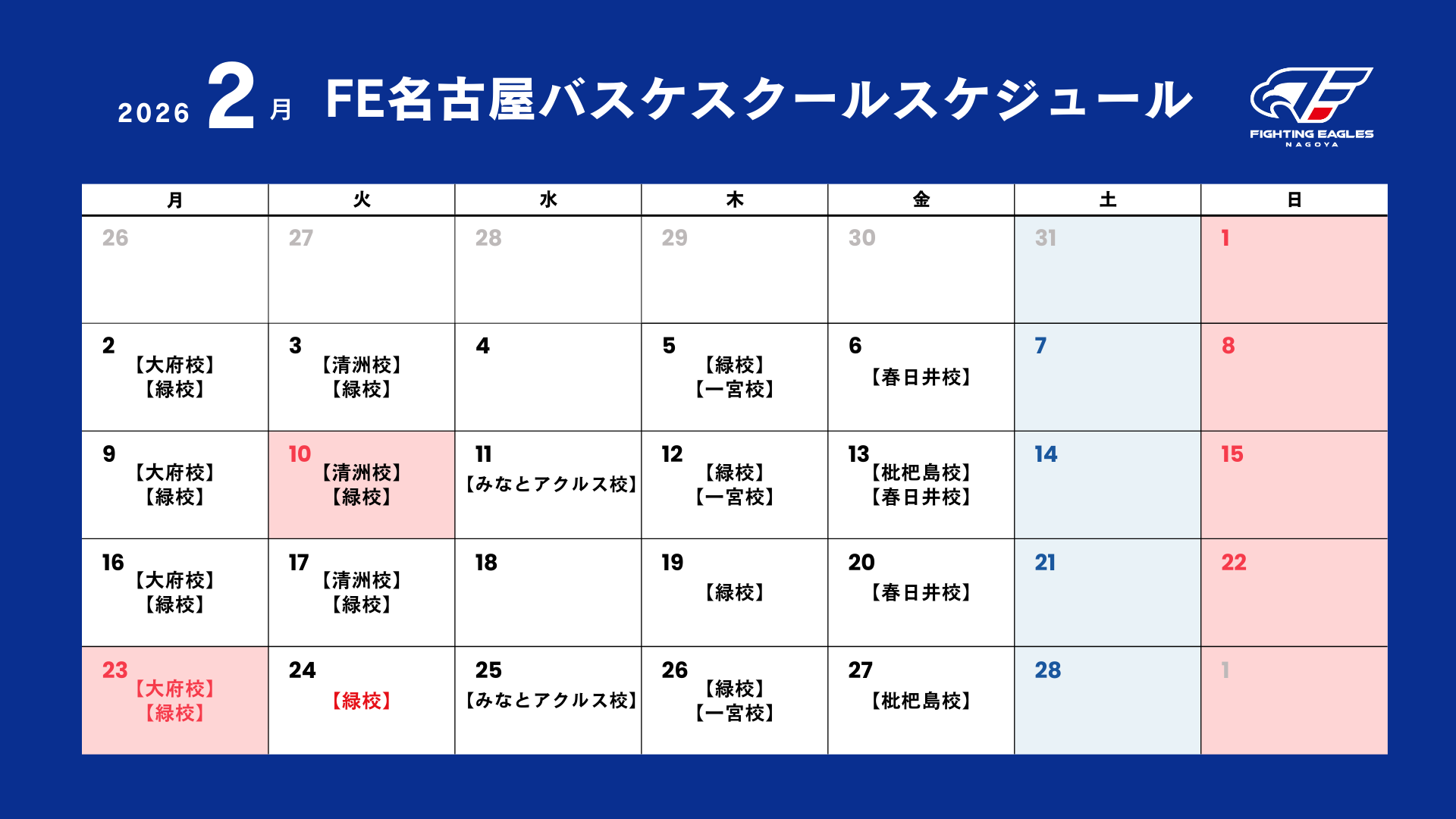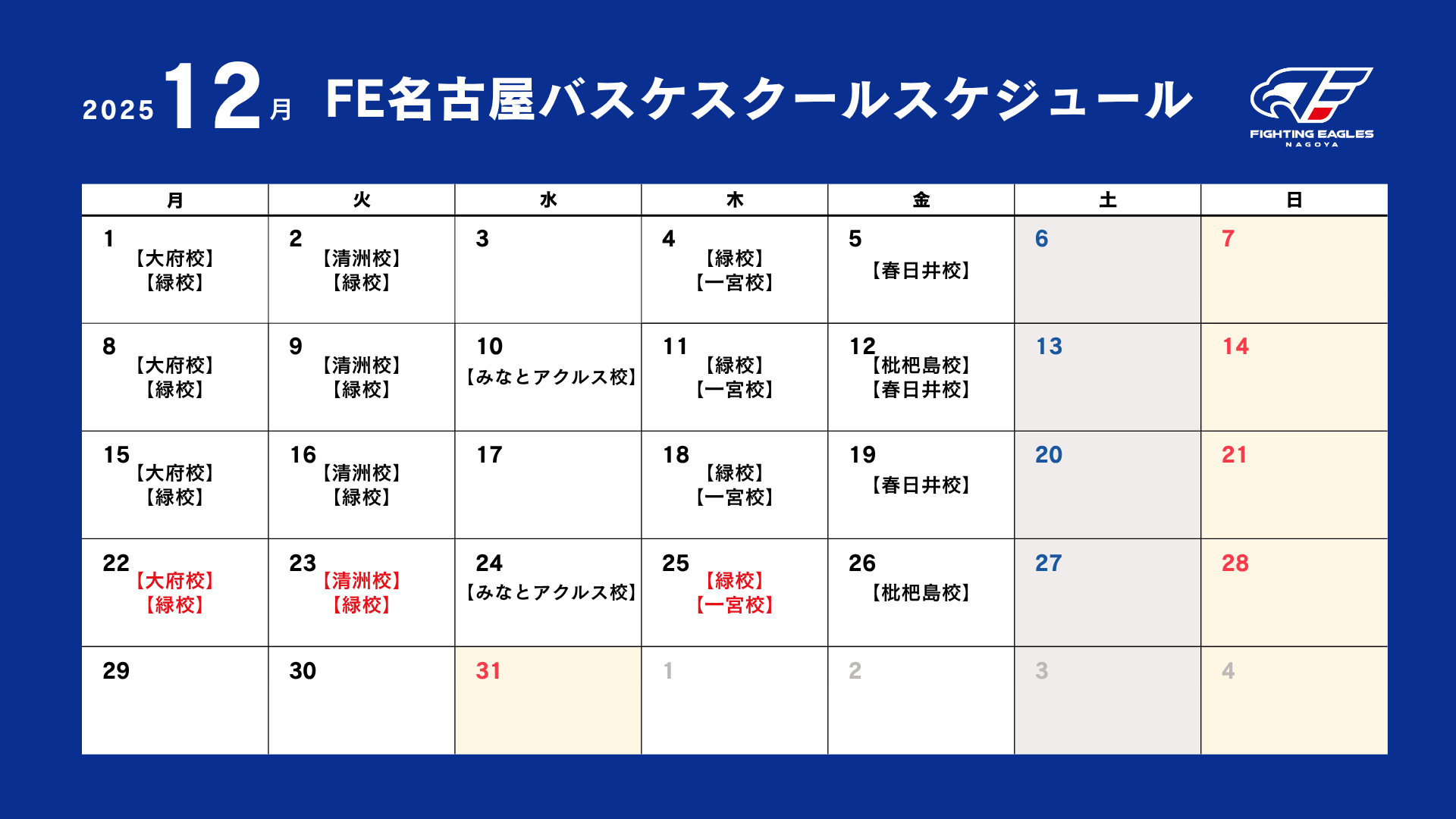 ※赤字で表示されている日程は「試合形式日」となるため、この日は無料体験会の実施はございません