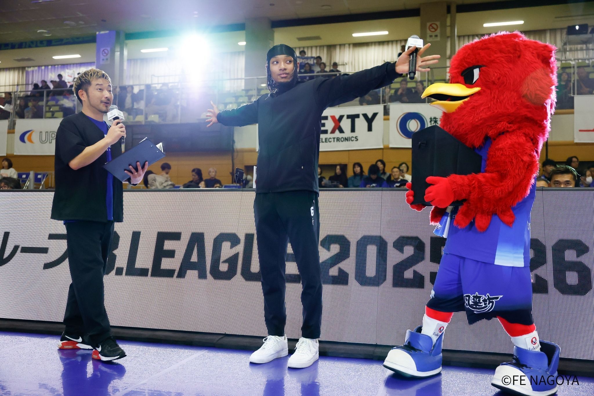 越谷の3Pシュートが決まり、ビハインドが8点に拡がる。その後、越谷にポゼッションを奪われたところで、FE名古屋がタイムアウト、13-21、残り9:14。タイムアウト明け、#0 ピケットのバスケットカウントが決まり、5点差に詰めるも、越谷に3Pシュートを許してしまう。残り7:48、#22 ジョーンズがフリースローを獲得し、2点を返す。続くディフェンスでスティールを決め、#0 ピケットがフリースローを獲得し、1点を返し、19-24。残り6分半、#0 ピケットがベースラインドライブから得点するが、直後に越谷にフリースローを与え、21-25。その後、越谷が3Pシュートを決めるも#23 保岡が3Pシュートを返す。しかし、越谷に高さを使われ、得点を許し、24-30となったところで、オフィシャルタイムアウト。タイム明け、#0 ピケットがフリースローを獲得するが、2本外してしまう。残り3分半、#1 バートンがドライブを決めるが、越谷がすぐに2点を返し、続けて、3Pシュートも与えてしまい、25-35とされる。FE名古屋は、#54 オマラがフローターを決め返すも、チームファールトラブルで越谷にフリースローでの得点を与えてしまう。FE名古屋は、#10 杉本がジャンパーを決めるも、越谷に返され、30-38、残り1:26でタイムアウト。タイムアウト明け、得点チャンスを決めきれず、越谷に追加点を与えてしまい、30-40の10点ビハインドで前半終了。