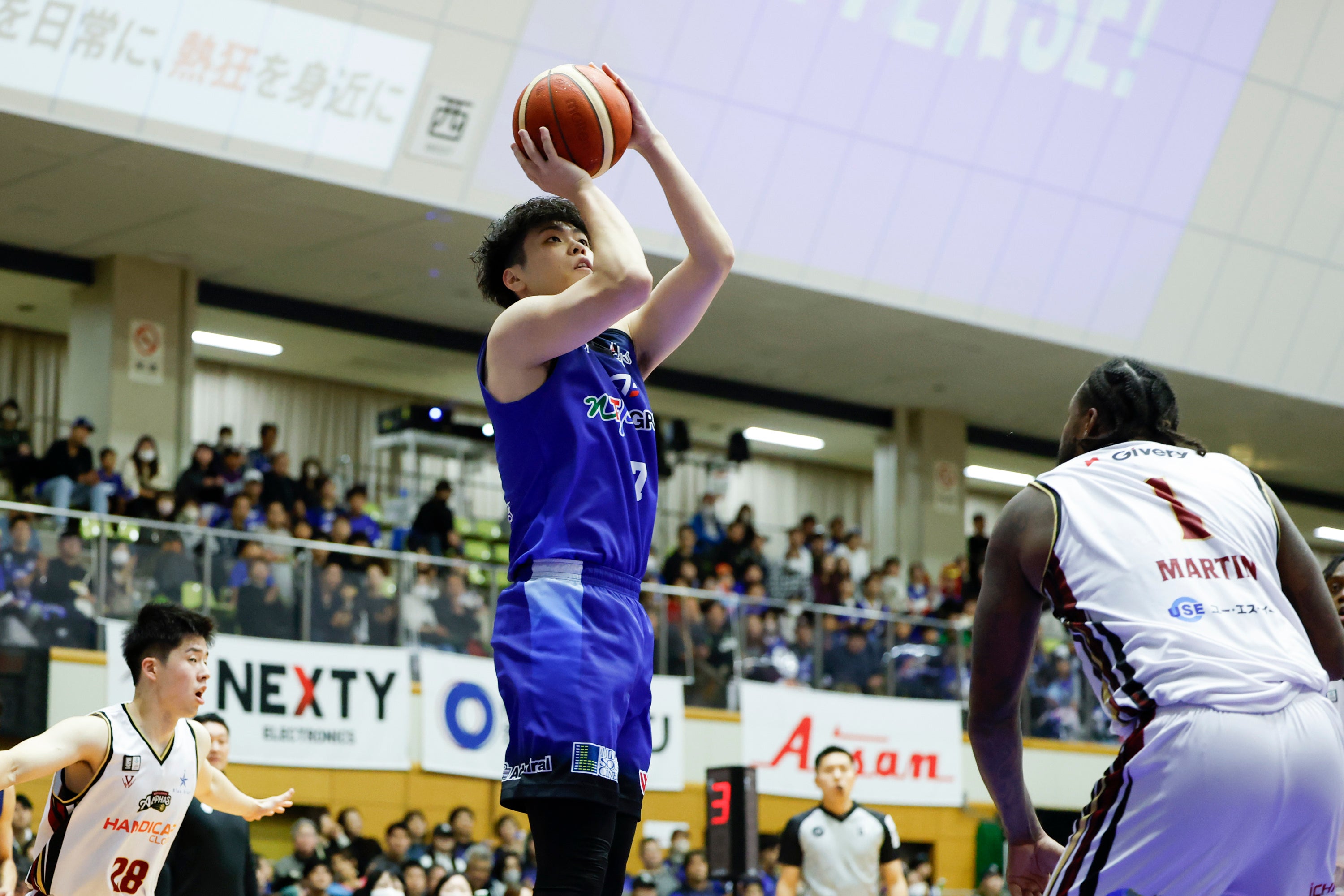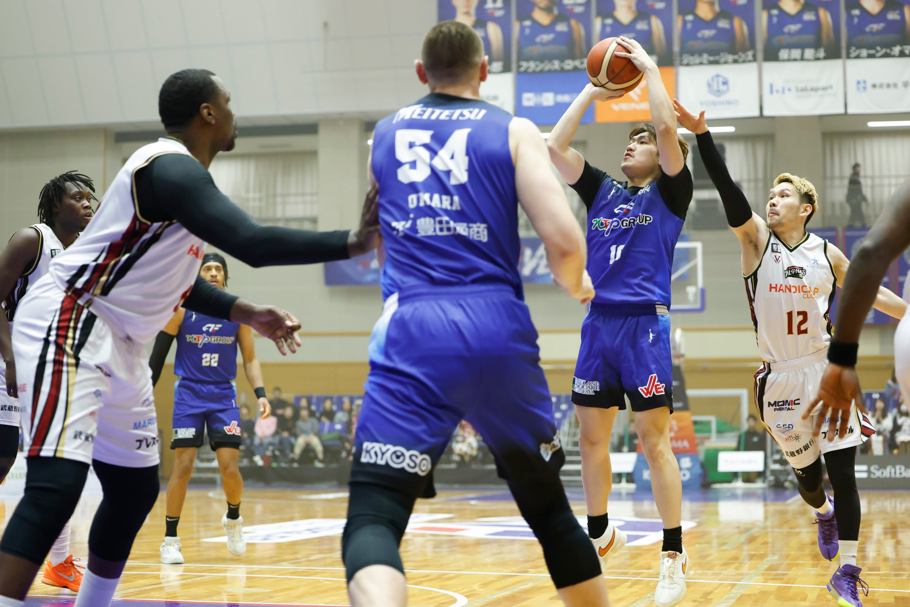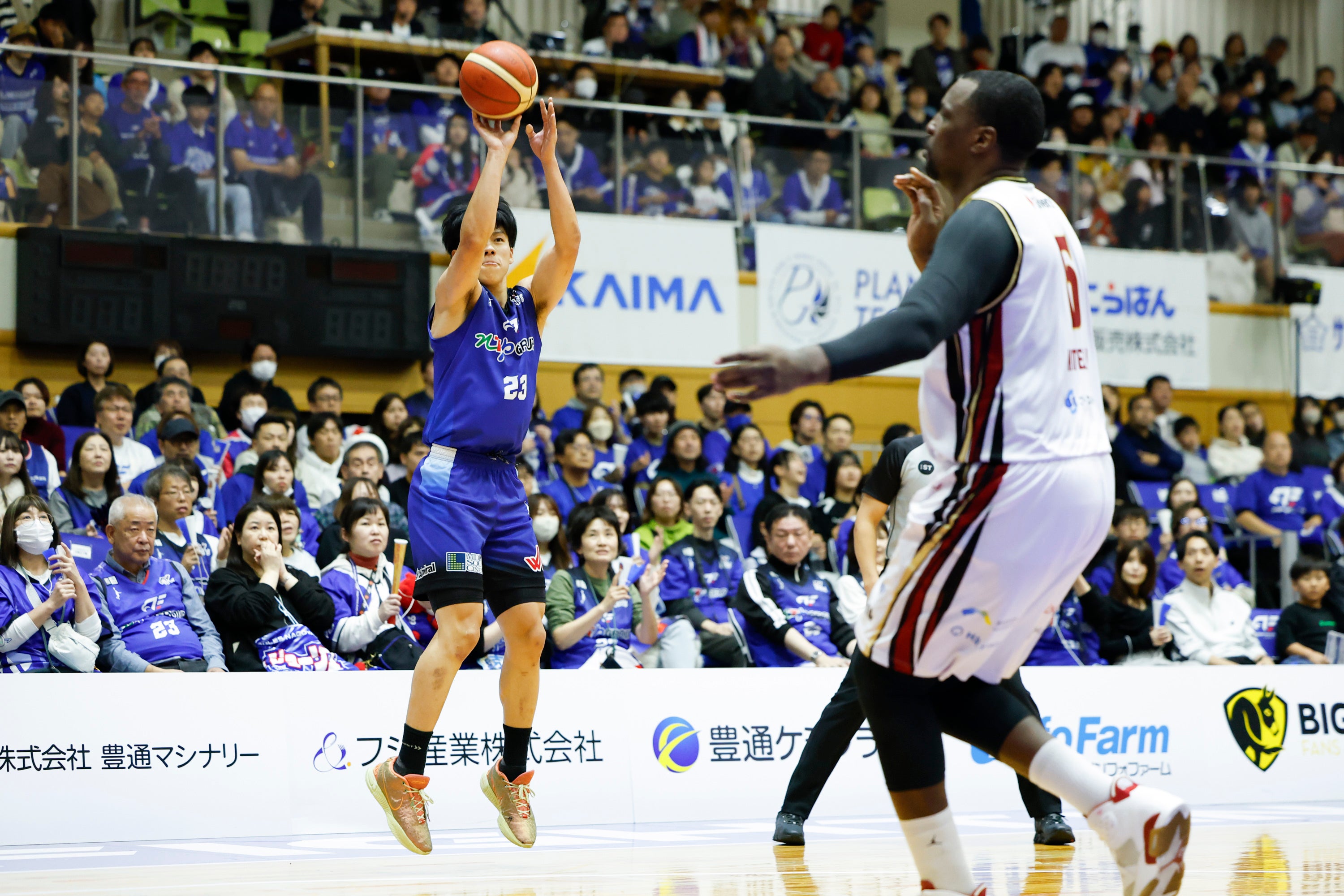 #10 杉本のジャンパーで先制。続くディフェンスで、越谷にオフェンスリバウンドからの得点を許すも、#12 平松が3Pシュートを沈めて先手を取る。しかし、越谷に連続得点を許し、リードチェンジ。3分が経過したところで、#12 平松がドライブを決めた後、#10 杉本が速攻に持ち込んで、9-6としたところで、越谷がタイムアウト、残り6:27。タイム明け、越谷に連続得点を許し、9-10とされるが、#54 オマラがフックシュートで取り返す。残り4分をきったところで、越谷に3Pシュートを許し、11-13となる。互いに決めきれず、時間が経過し、残り2分半のところで、#23 保岡がフリースローを獲得し、同点とする。直後のディフェンスで、越谷にフリースローを与えてしまい1点ビハインド、さらに越谷に追加点を与えた後、バスケットカウントも許し、残り49秒で、13-18と5点のビハインドを背負い、そのまま1Qが終了。