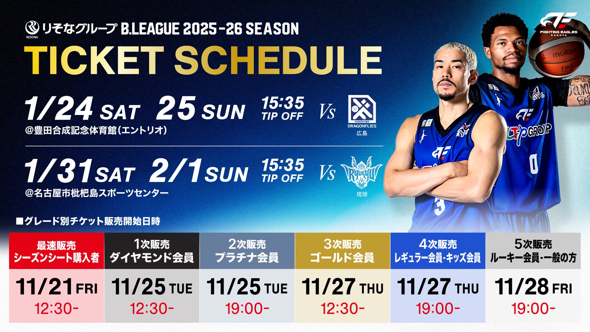 1/24(土)25(日)広島ドラゴンフライズ戦の「初♡フィバ ~2026 遅ればせながら~」、1/31(土)2/1(日) 琉球ゴールデンキングス戦の「えらばれたいんデー | LOVE 2026 week1」はともに「ランクA」にてチケットを販売いたします。