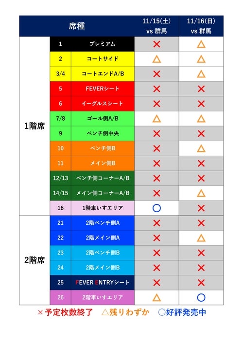 ■11/15(土)16(日) 群馬戦 チケット販売状況 (11/11(火)時点)