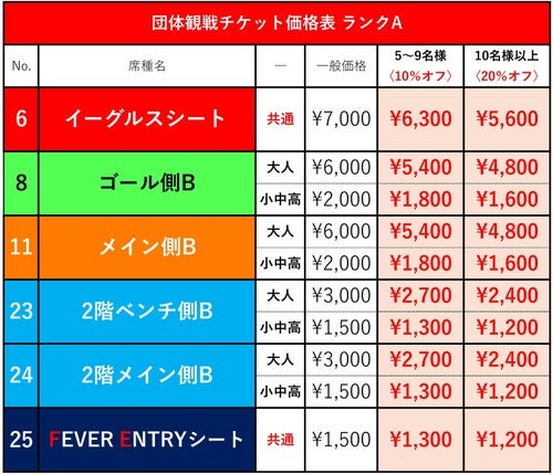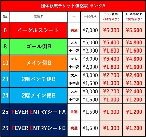 ※「ファンクラブ」もしくは「一般販売」用の窓口からは割引価格になりません。必ず団体観戦チケット専用の窓口よりご購入ください