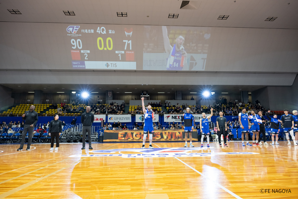 #0 ピケットの得点で、逆転してスタート。続けて、#3 並里の3Pシュートが決まり、リードを4点とした後、#54 オマラが走って、バスケットカウントを奪い、69-63、残り8:14で、富山がタイムアウト請求。 タイムアウト明け、ボーナススローが決まって、7点差でリスタート。 さらに#54 オマラのダンクで加点した後、#3 並里が落ち着いてジャンパーを沈め、リードを二桁にしたところで、富山がたまらずタイムアウト請求、74-63、残り7:01。 タイムアウト明け、富山にバスケットカウントを与えてしまい、8点差に詰め寄られる。しかし、すぐに#3 並里が3Pシュートで取り返す。 その後、富山にフリースローを与えたところで、オフィシャルタイムアウト、77-66。 タイムアウト明け、フリースローが1本決まって、10点差でリスタート。 #54 オマラのバスケットカウントダンクが決まって、79-67。さらに#3 並里がジャンパーを決める。 富山のチームファールトラブルで、フリースローを獲得し、残り3:46で、82-67とする。 富山はファールが多くなり、フリースローでリードを拡げることに成功。 残り3分、#54 オマラが追加のダンクを決めて、86-67。 その後、互いに入れ合うも、FE名古屋がしっかりとリードを保って試合を進め、最終スコア、90-71で、勝利した。