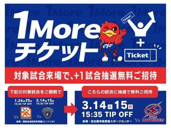 「1月24日(土)25日(日) 広島ドラゴンフライズ戦」「2月14日(土)15日(日) 横浜ビー・コルセアーズ戦」にご来場いただいた方の中から抽選で「3月14日(土)15日(日) 川崎ブレイズサンダース」戦に無料ご招待する『1Moreチケット』企画を実施いたします。