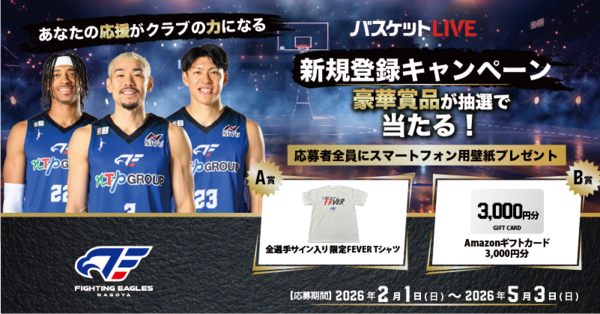 2025-26シーズンも後半戦に突入し、さらに熱い試合が続くこの時期に『FE名古屋 <新規登録限定>豪華賞品が当たる!バスケットLIVE登録キャンペーン【後半戦】』を実施いたします。