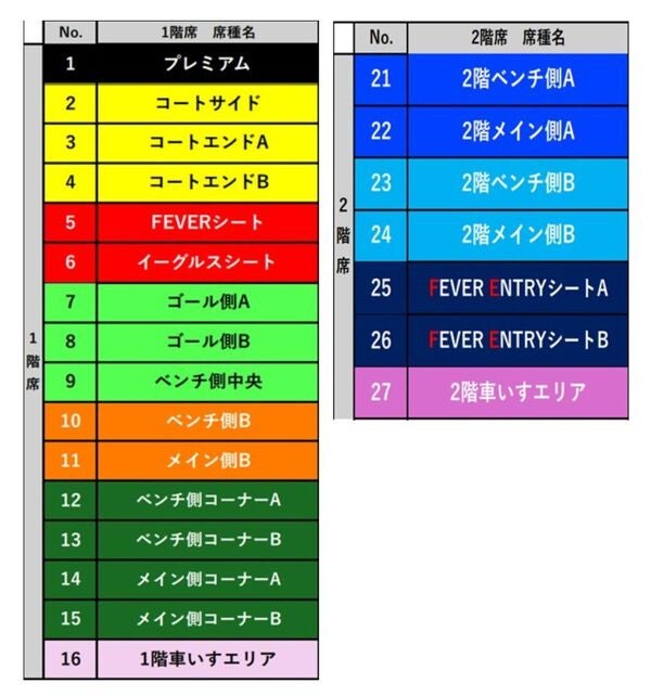 ②コートサイド2~3列目、③コートエンドA 2~4列目、④コートエンドB 2~4列目、⑤FEVERシート1~2列目、⑨ベンチ側中央1~2列目、⑩ベンチ側B 1~2列目