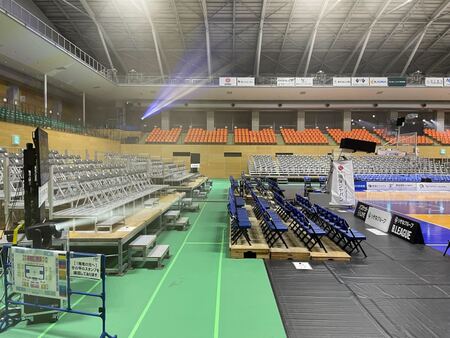 ※「仮設(ひな壇)の席」は「板の上に設置する席」と同じ高さから設置されるのではなく、土台分の高さを確保した上で段状に設置いたします。そのため、「仮設の席」の最前列からコートを見た際にも、「板の上に設置する席」が大きく視界をさえぎることはございません