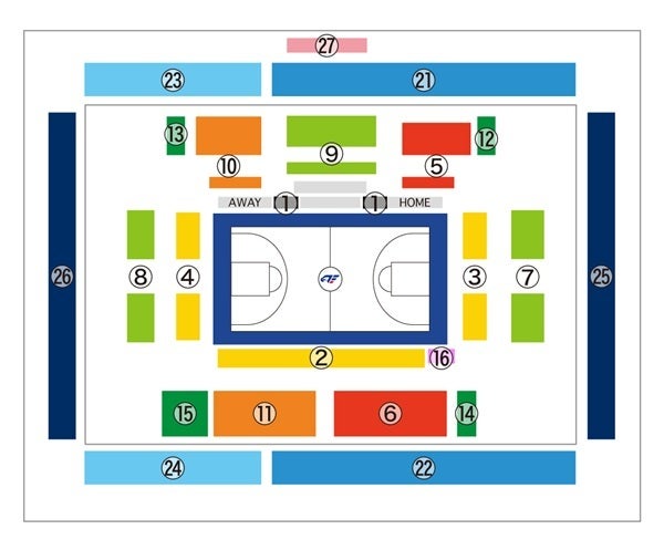 ①プレミアム、②コートサイド 1列目、③コートエンドA 1列目、④コートエンドB 1列目、⑯1階車いすエリア