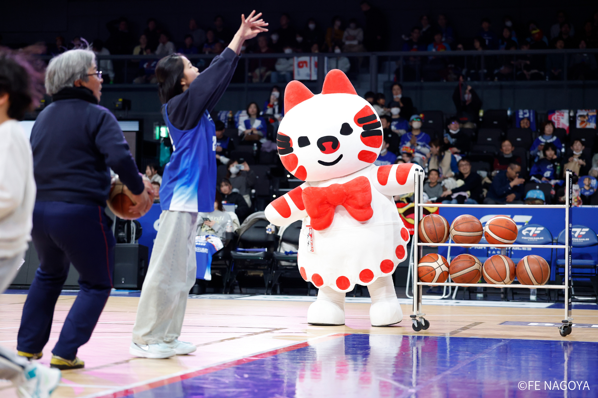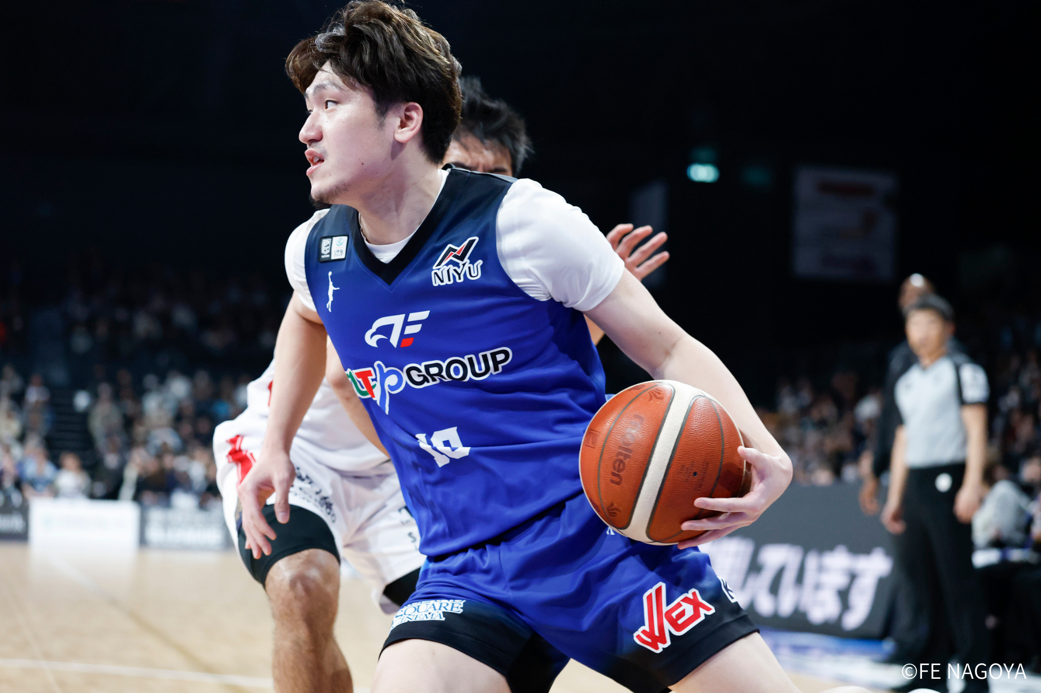 横浜BCにドライブを許し、リードされてスタート。#0 ピケットがドライブで取り返す。残り7分半となり、#54 オマラがインサイドで得点。直後に横浜BCにフリースローを与えてしまうも、横浜BCが1本外し、1点差となり、続くオフェンスで#23 保岡が得点を決めて、29-26とする。 しかし、横浜BCが3Pシュートを沈め、同点に戻る。その後、#0 ピケットがインサイドで得点し、31-29で、オフィシャルタイムアウトに入る。タイムアウト明け、横浜BCが3Pシュートを沈めて、リードチェンジ。すぐに#22 ジョーンズが走って、リードを奪い返す。 FE名古屋は、ディフェンスをゾーンに変えてポゼッションを奪うと、#21 笹山が走ってフリースローを獲得し、3点リードとする。残り3分をきったところで、横浜BCにルーズボールを奪われ1点差。時間が経過し、残り1:41となったところで、#20 ロペスがフリースローを獲得し、37-34。 横浜BCが、直後に得点した後、FE名古屋がミスでポゼッションを失うと連続得点を許し、37-38と逆転されて、タイムアウト請求、残り1:12。タイムアウト明け、#21 笹山の3Pシュートで逆転に成功し、40-38で、前半終了。