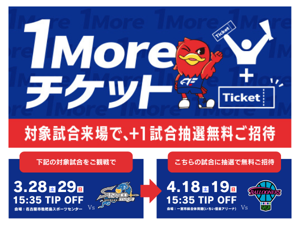 「3月28日(土)29日(日) 島根スサノオマジック戦」にご来場いただいた方の中から抽選で「4月18日(土)19日(日) 佐賀バルーナーズ戦」に無料ご招待する『1Moreチケット』企画を実施いたします。