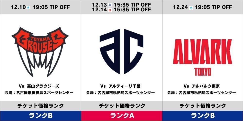 12/10(水)富山グラウジーズ戦、 12/13(土)14(日) アルティーリ千葉戦、 12/24(水)アルバルク東京戦 のチケット販売概要をお知らせいたします。