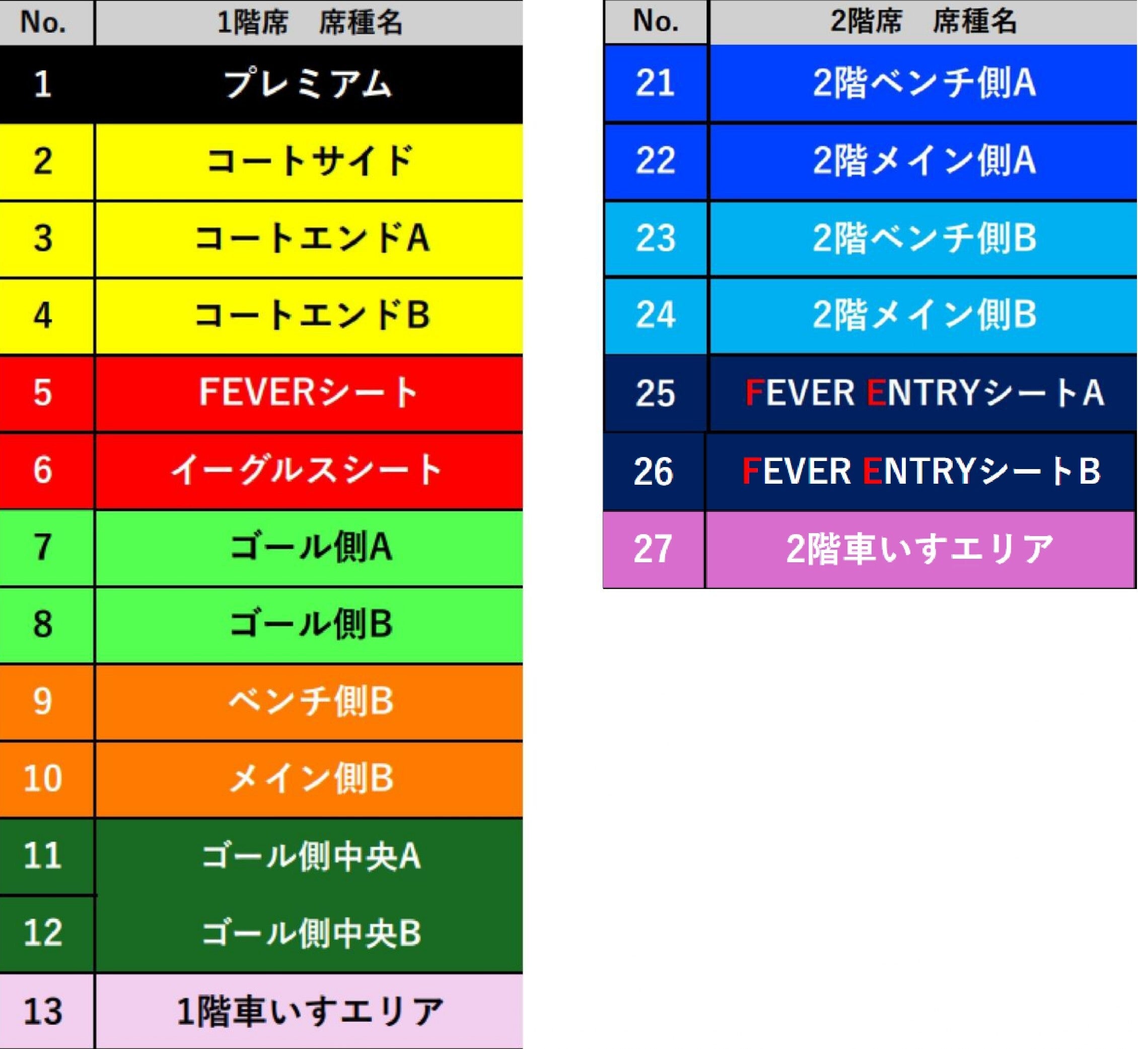 下記の席種・列については、柵などのアリーナ既存設備、ゴール支柱などによりコートが見えにくい可能性があります。予めご了承いただいた上でお買い求めください。