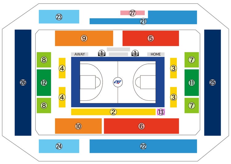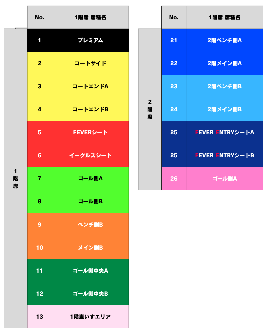 下記の席種・列については、柵などのアリーナ既存設備、ゴール支柱などによりコートが見えにくい可能性があります。予めご了承いただいた上でお買い求めください。