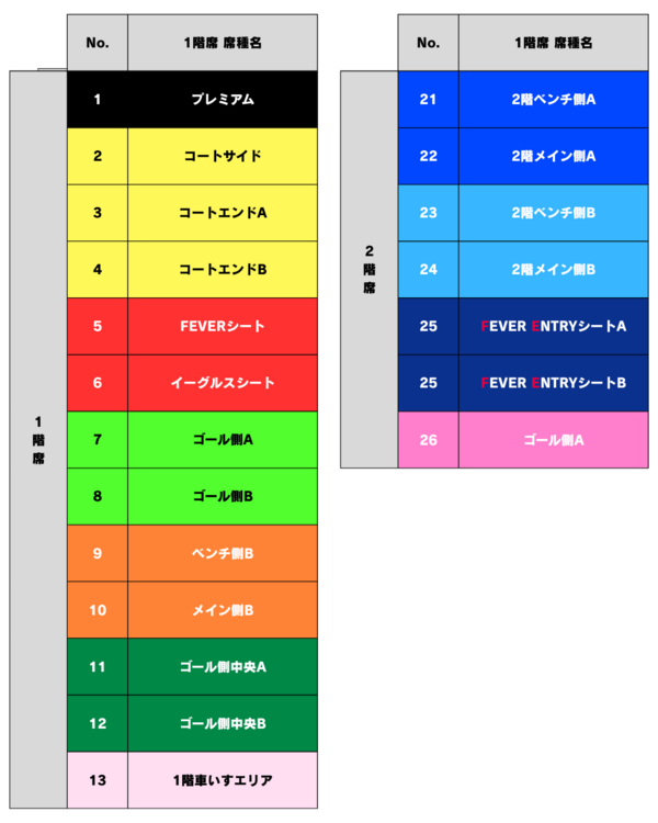 ㉑2階ベンチ側A、㉒2階メイン側A、㉓2階メイン側B、㉕FEVER ENTRYシート A、㉖FEVER ENTRYシートB、㉗2階車いすエリア
